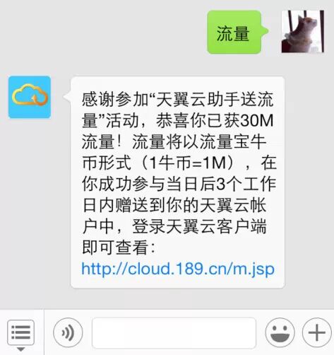 即日起至9月26日,只要关注&绑定“天翼云助手”微信或易信公众号(Cloud_189),发送通关密语“流量”给助手,即可领取30M流量!先到先得,速度来领!